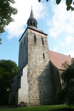 An der Westseite des Turmes ist ein großer Inschriftstein eingelassen, der auf die Erneuerung der Kirche im 19. Jh. durch den Grafen Behr-Negendank hinweist, mit dessen Familie die Geschichte der Kirche eng verbunden ist. Im Turm befinden sich drei Glocken (von 1611, 1447 und aus dem Ende des 14. Jh.) und ein voll funktionierendes Uhrwerk von 1856.