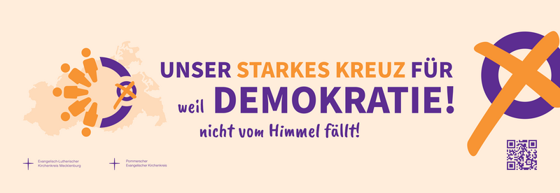 Deshalb engagieren wir uns als Kirchenkreise Mecklenburg und Pommern in der Nordkirche im Vorfeld der Landtagswahlen, die am 20. September 2026 stattfinden, mit der Kampagne: „Unser starkes Kreuz für Demokratie – Ich bin dabei!/…weil Demokratie nicht vom Himmelfällt!“ Wir rufen insbesondere Christinnen und Christen damit auf, wählen zu gehen.