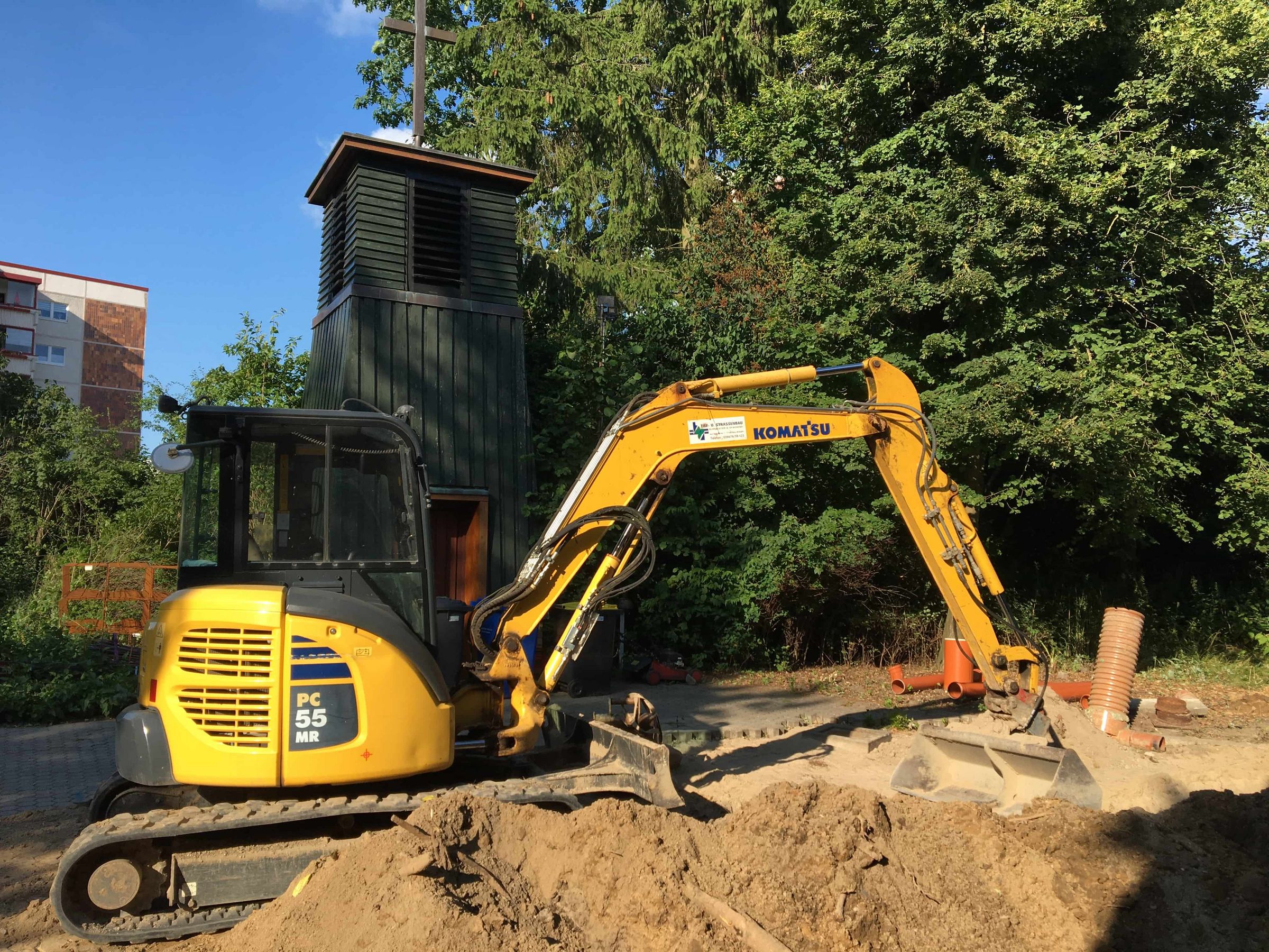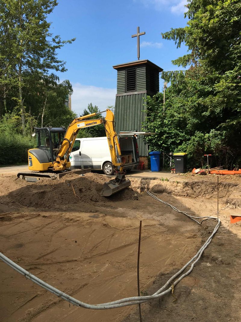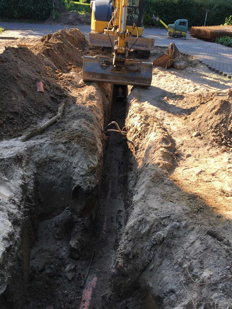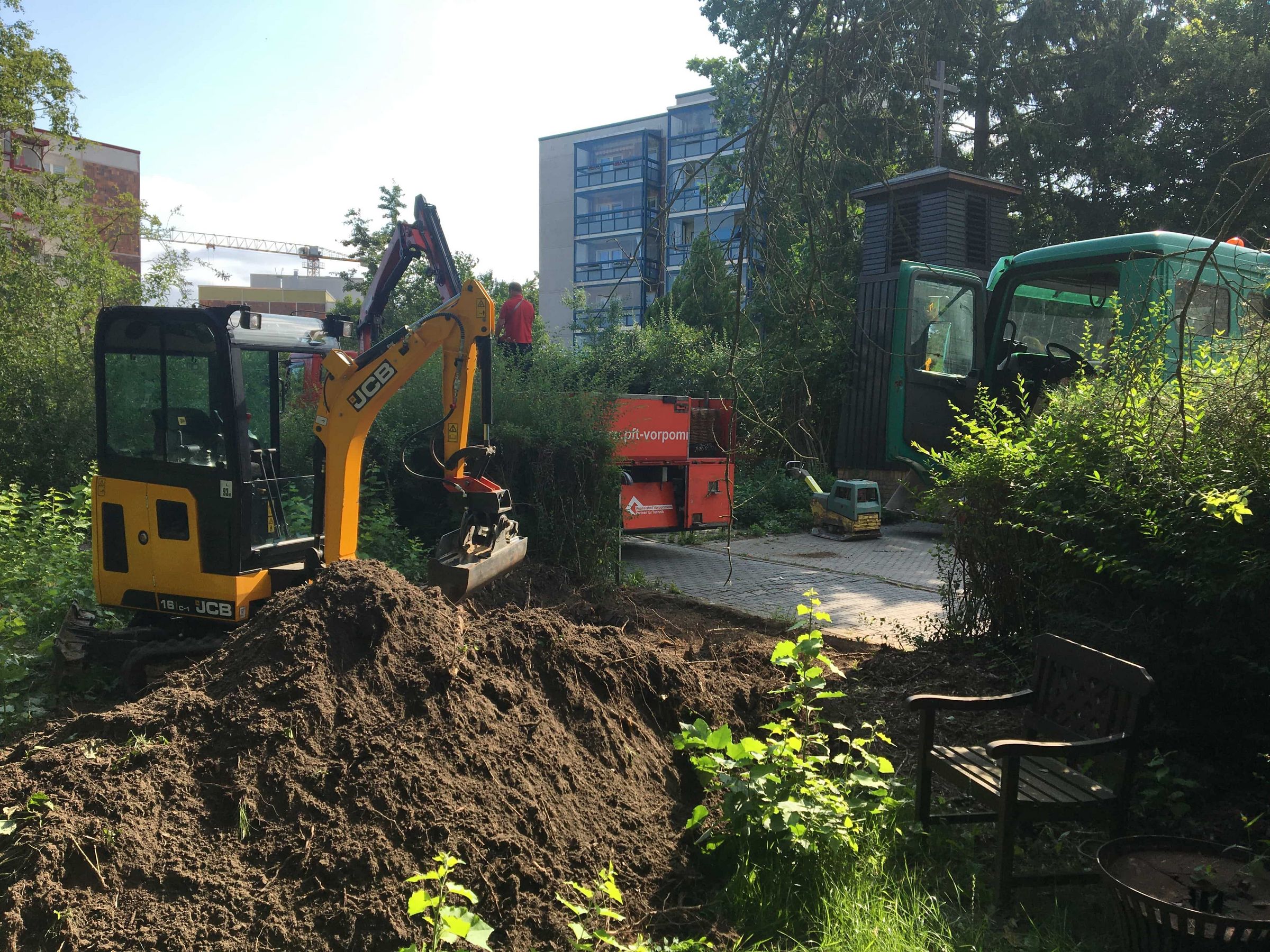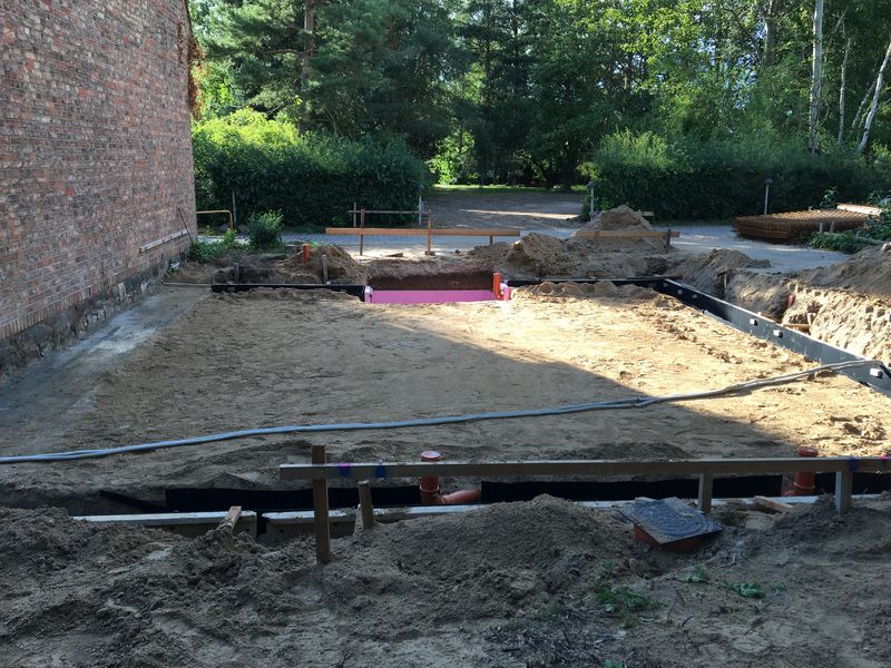 Nun geht es endlich los. Bauarbeiter mit Bagger und Radlader haben begonnen die Fundamente für den Anbau zu errichten. Im ersten Schritt muss ein Teil der Abwasserleitung verlegt werden. Anschließend wird die Verbindung zwischen dem Fundament des Anbaus und des bestehenden Slüterhauses geschaffen.