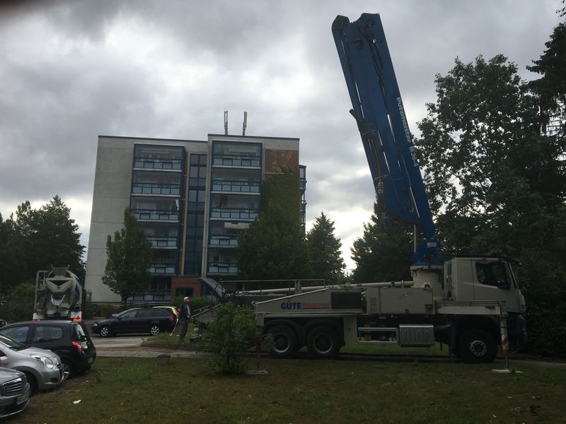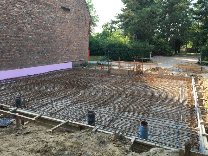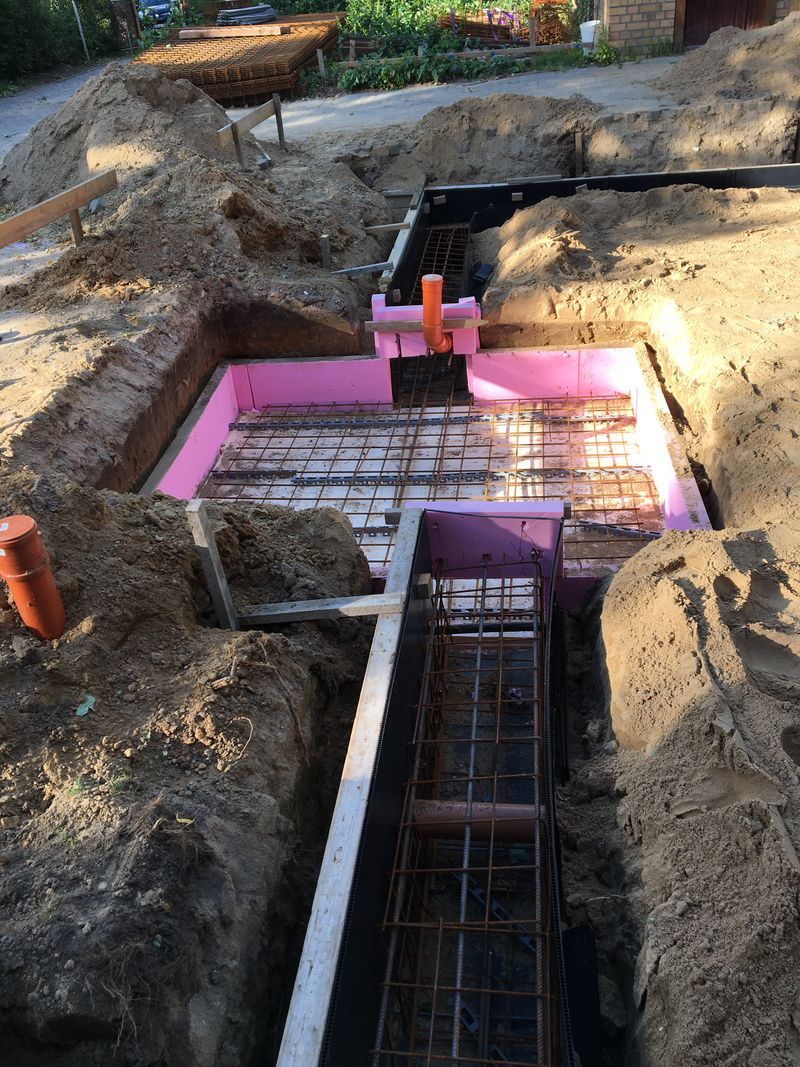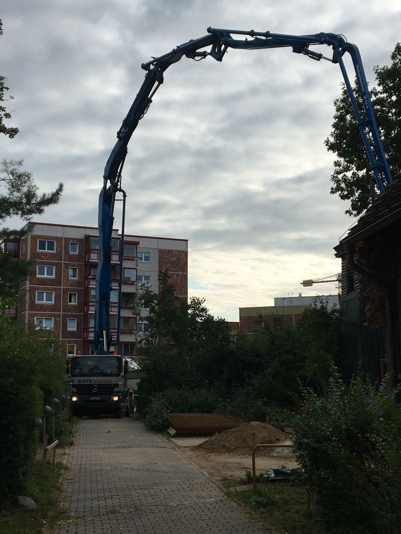In den letzten Tagen wurde an der Bewehrung und den Verschalungen für die Streifenfundamente gearbeitet. Der untere Teil des Fahrstuhlschachts ist durch die rosafarbene Dämmung schon gut erkennbar. Heute wurde der erste Beton geliefert. Eine riesige Betonpumpe beförderte 16m³ Beton aus den zwei Mischfahrzeugen an die richtigen Stellen im Fundament.
