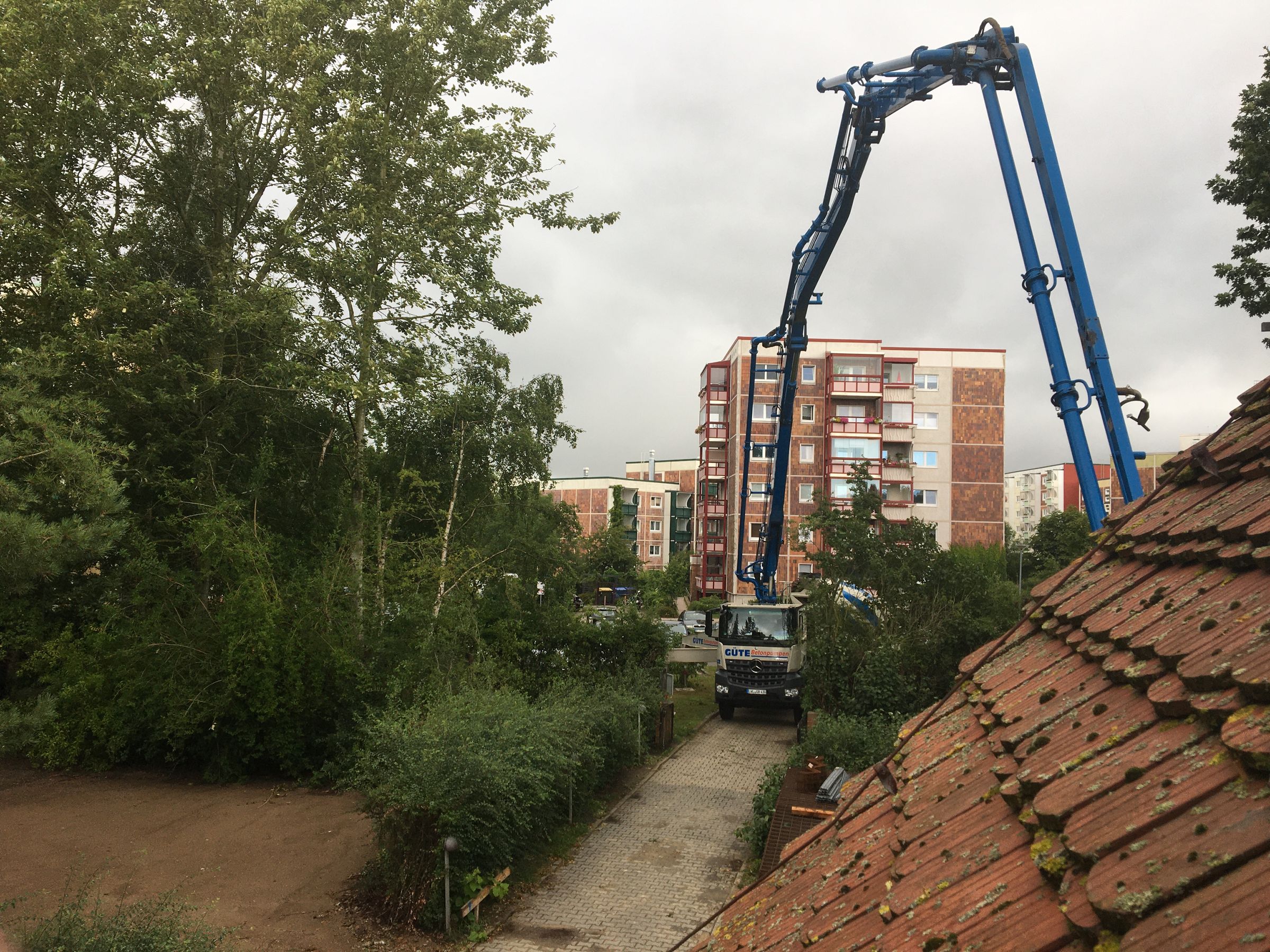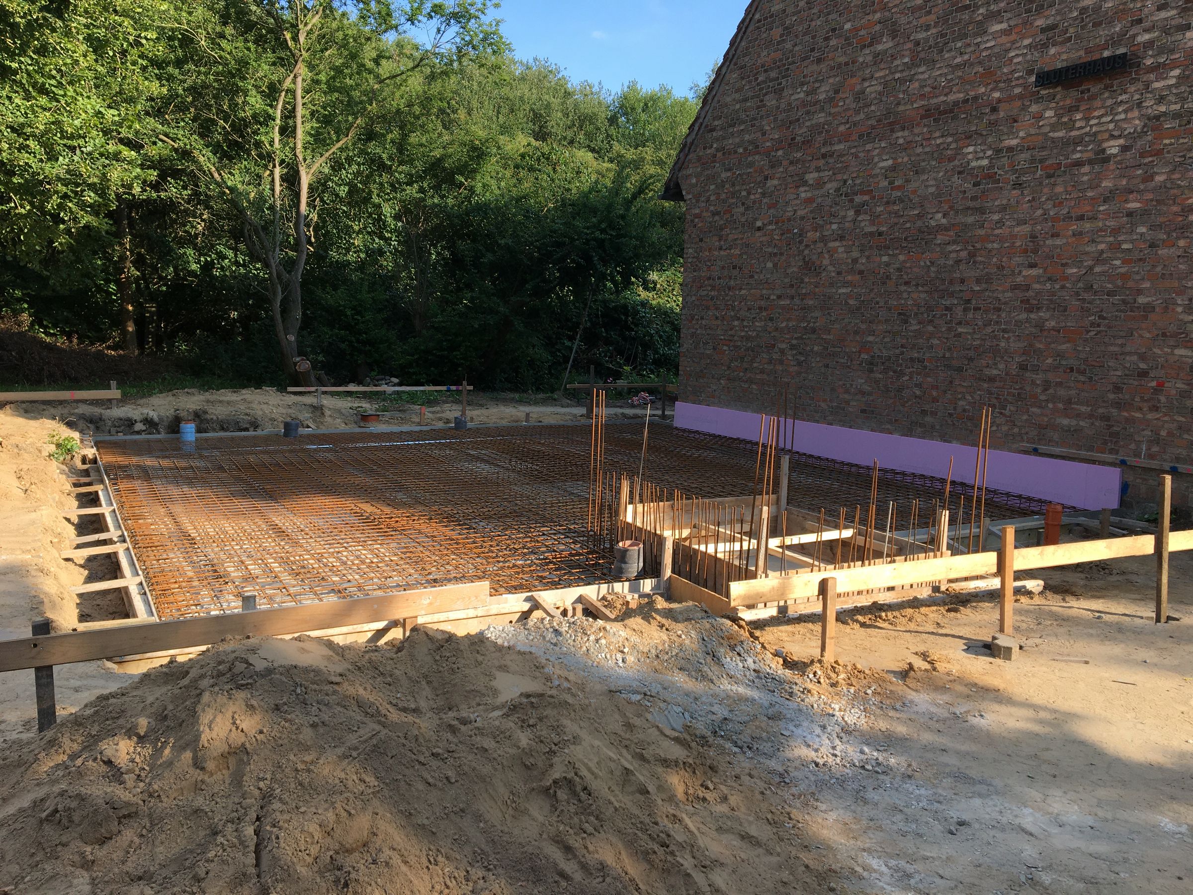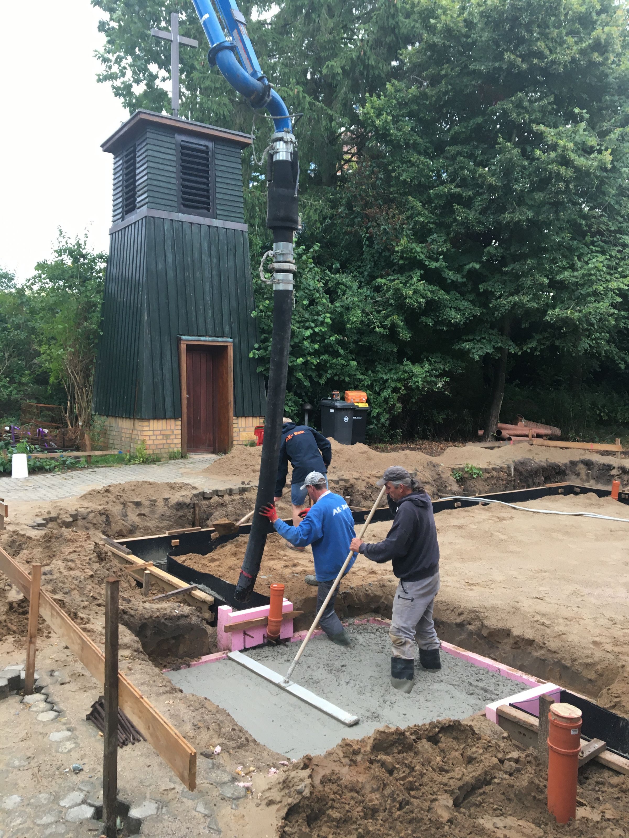 In den letzten Tagen wurde an der Bewehrung und den Verschalungen für die Streifenfundamente gearbeitet. Der untere Teil des Fahrstuhlschachts ist durch die rosafarbene Dämmung schon gut erkennbar. Heute wurde der erste Beton geliefert. Eine riesige Betonpumpe beförderte 16m³ Beton aus den zwei Mischfahrzeugen an die richtigen Stellen im Fundament.
