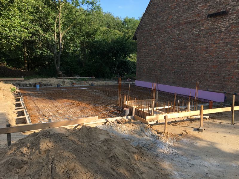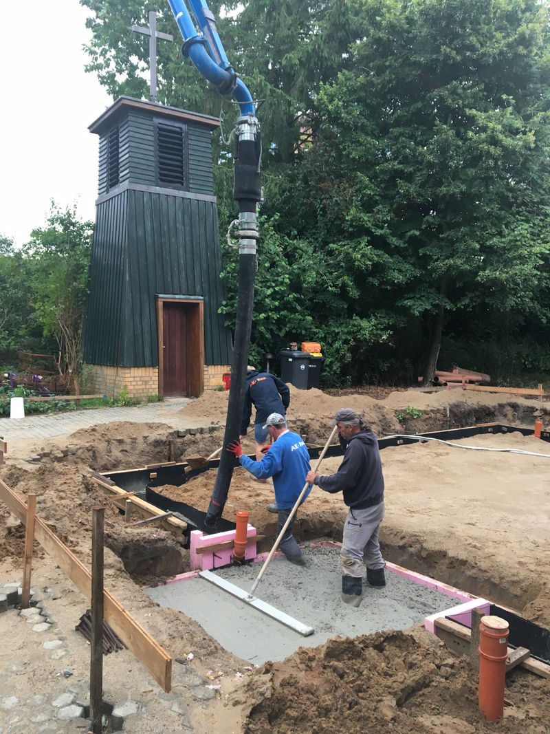 In den letzten Tagen wurde die Bewehrung für die Bodenplatte fertiggestellt. Mit Hilfe eine Betonpumpe wurden 19m³ Beton an die richtigen Stellen befördert. Nun ist die Bodenplatte fertig. Sie muss einige Zeit (ca. 3 Wochen) aushärten. Danach wird dann in die Höhe gebaut.