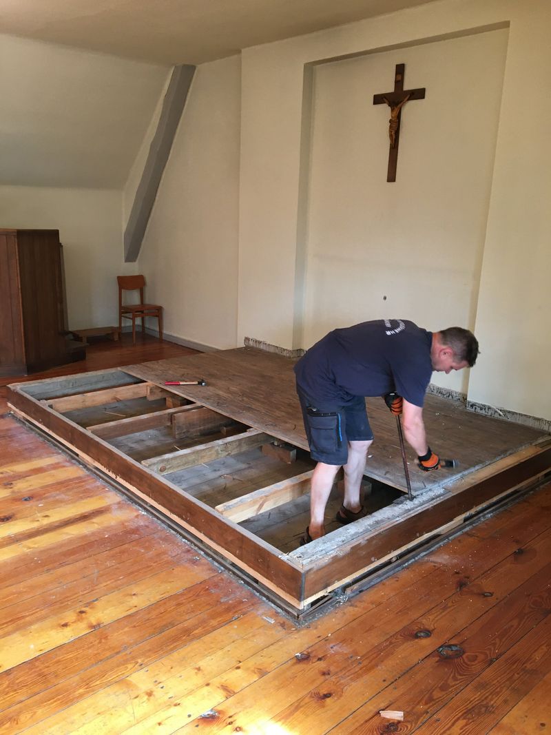 Dort wo im Slütersaal bisher der Altar stand, wird zukünftig die Tür zum Anbau sein. Deshalb musste das Altarpodest abgebaut werden. Herzlichen Dank an Uwe Bruhn für seine große Hilfe!