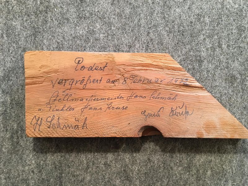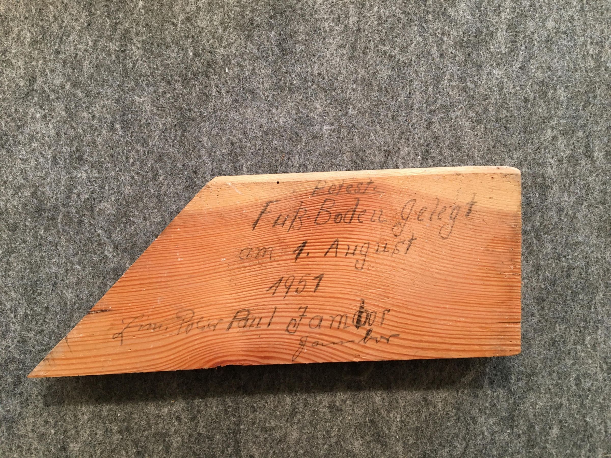 Unter dem Podest haben wir ein Brett mit zwei Inschriften gefunden. Sie weisen auf den Erbauer des Podests und auf eine Erweiterung im Jahr 1972 hin.