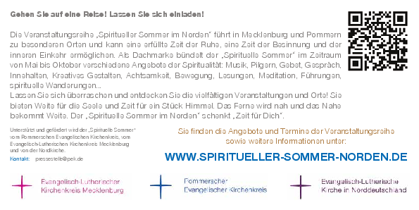 Um viele Menschen in direktem Kontakt, bei Messen oder vor Ort, in Flyer-Ständern etc. auf den "Spirituellen Sommer im Norden" und seine Vielfalt hinweisen zu können, wurde ein handlicher, auf ökologisch zertifiziertem Recyclingpapier gedruckter Flyer im DIN-Lang-Format erstellt, der mit einem kurzen, eingängigen Text über die Veranstaltungsreihe informiert, alle notwendigen Infos übersichtlich vermittelt und vor allem per QR-Code direkt auf die Internetseite und damit zu allen Veranstaltungen des "Spirituellen Sommers" führt.