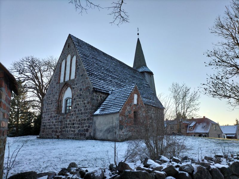 Hierbei handelt es sich um einen frühgotischen feldsteinquaderbau mit Motiven des Übergangstiles, etwa um 1300 errichtet. Vermutlich vor dem Dreißigjährigen Krieg wurde ein freistehender Fachwerktumr vorgebaut.