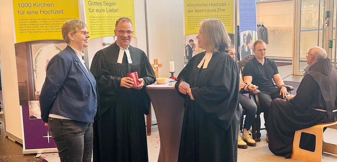 Evangelische und katholische Kirche zum vierten Mal mit eigenem Stand vertreten MV-Bischof Tilman Jeremias besucht Rostocker Hochzeitsmesse