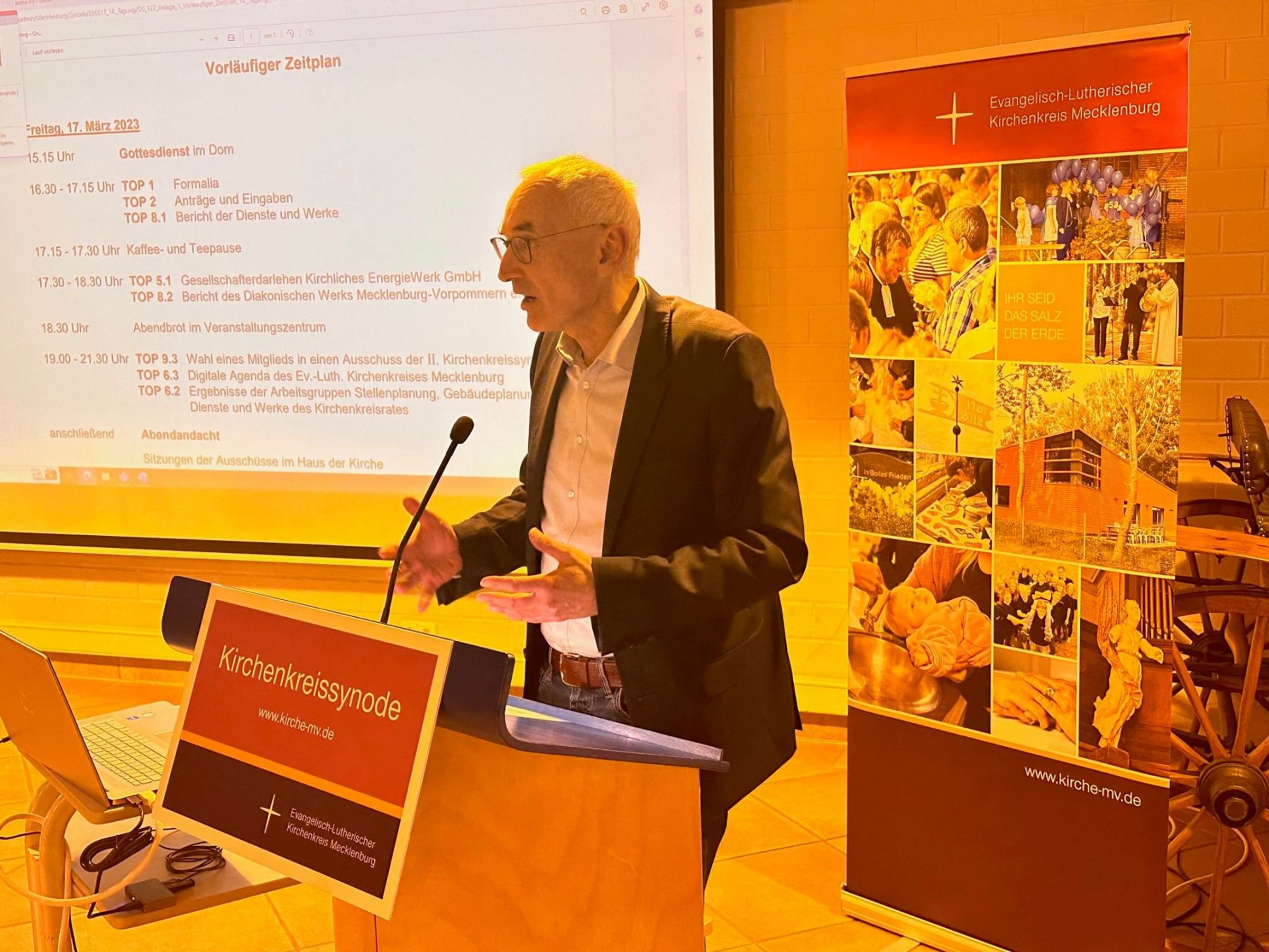 18.03.2023 | Güstrow. Mecklenburgische Synodale berieten digitale Agenda, Stellen- und Gebäudeplanung - Mitfinanzierung eigener Windenergie-Anlagen auf Kirchenland möglich