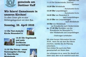 Schauen Sie sich die Kirchen an, besuchen Sie unsere Gottesdienste und Veranstaltungen oder eines der vielen Konzerte, die vor allem im Sommer stattfinden. In Ueckermünde wird, von Ausnahmen abgesehen, jede Woche Gottesdienst gefeiert. In der kalten Jahreszeit überwiegend in der (gut beheizbaren) Kreuzkirche und in der wärmeren Jahreszeit in der Marienkirche. In den Dorfkirchen finden in größeren Abständen Gottesdienste statt.