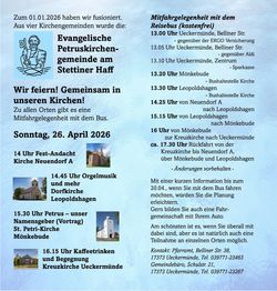 VeranstaltungFusionsfeier - Orgelmusik und mehr 26.04.2026 · 14:45 Uhr · 15:45 Uhr Kirche LeopoldshagenDorfstraße17375 Leopoldshagen Im Kalender speichern (.ics) Route berechnen zurück zur Übersicht der Veranstaltungen StartseiteGottesdienste und VeranstaltungenGruppen und KreiseKirchenmusikKirchenSt. Marienkirche UeckermündeKreuzkirche UeckermündeLiepgartenMönkebudeLeopoldshagenAltwigshagenLübsNeuendorf AWietstockFriedhöfeBauvorhaben/SpendenkontoNewsletter/ Impressum für InstagramKontakt und MitarbeitendeAnmelden