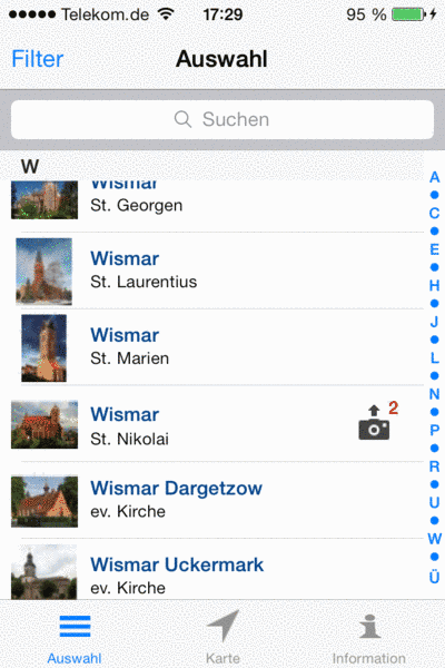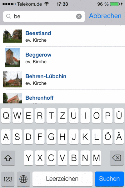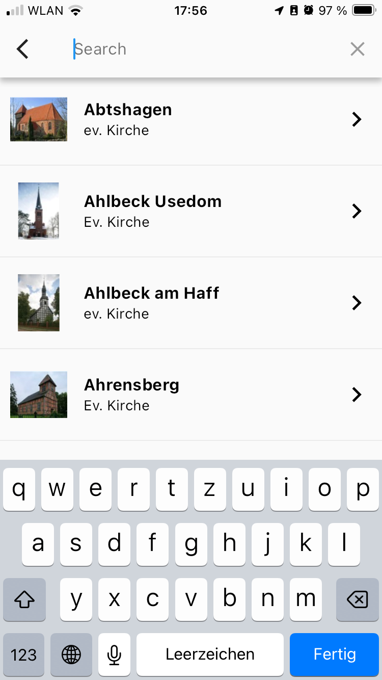 Die Bauwerke werden in einer Liste mit einem Mini-Bild gezeigt. In das Suchfeld kann ein Ort eingeben werden.