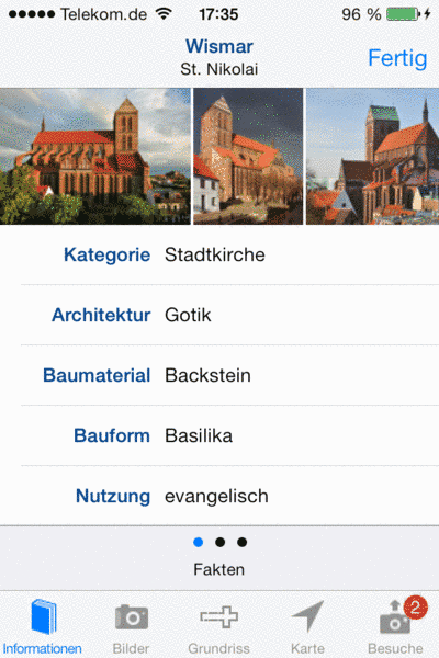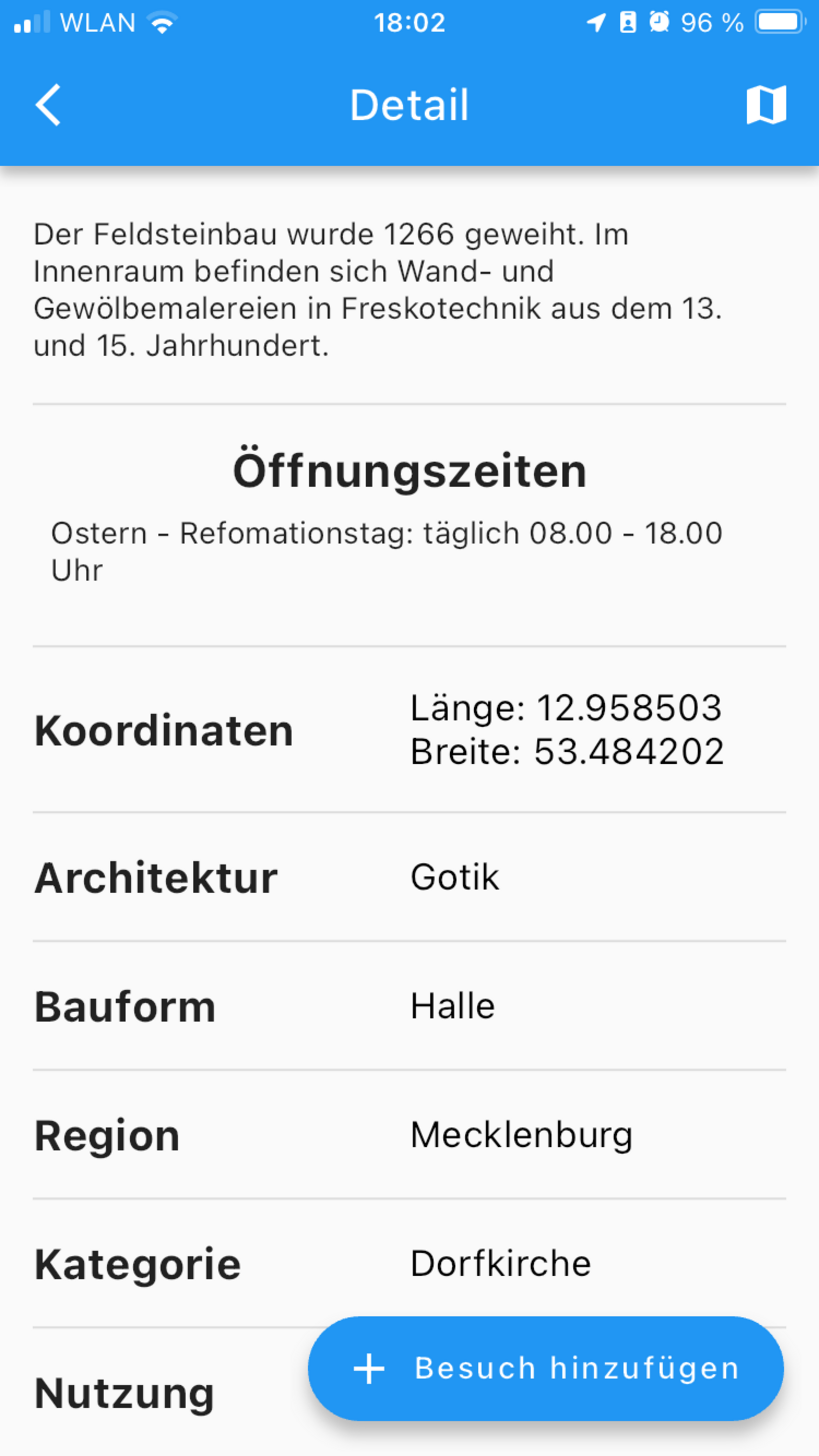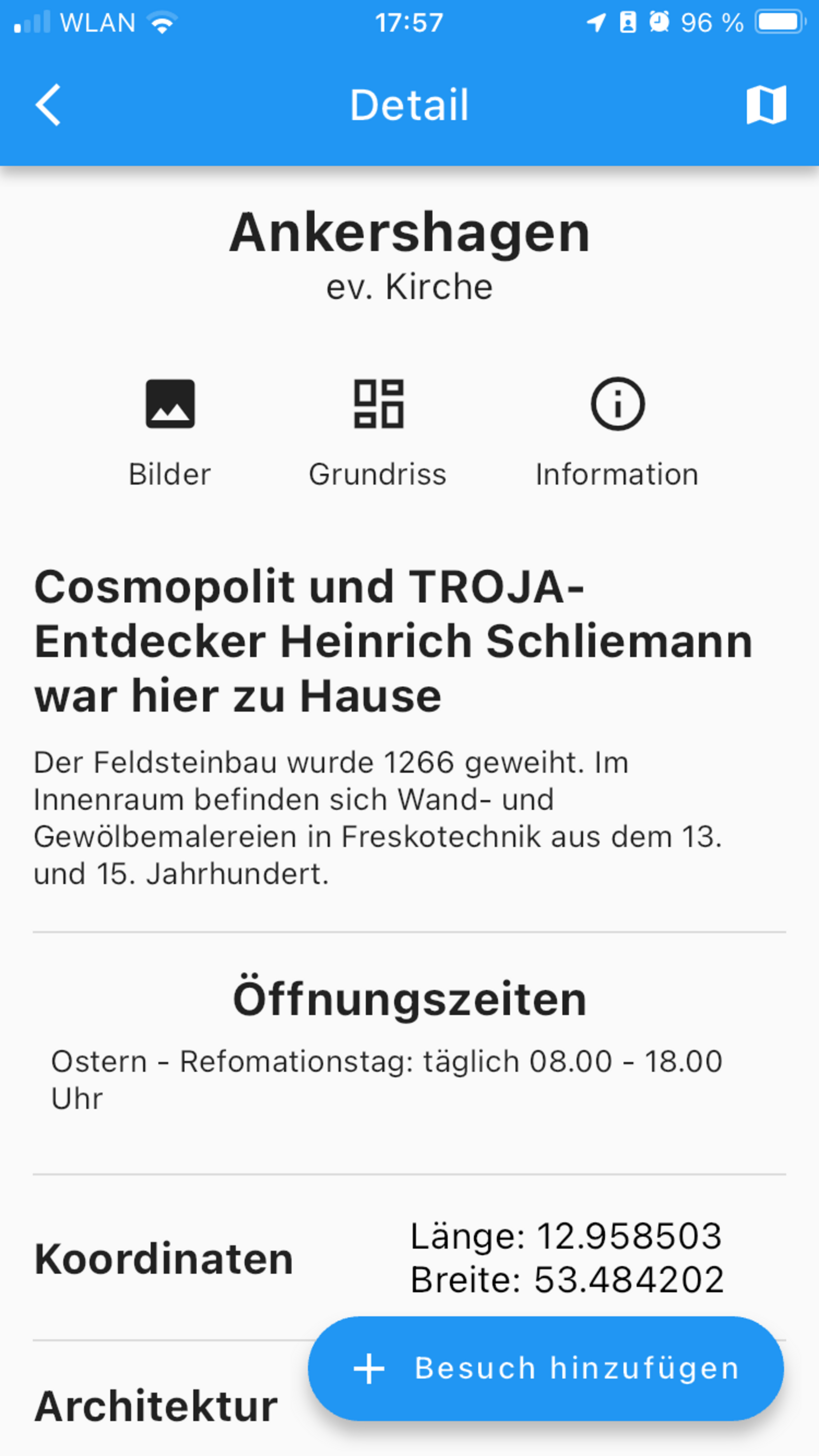 Durch die Auswahl eines Bauwerkes in der Listen- oder Kartendarstellung gelangt der Anwender zu den Details des ausgewählten Bauwerks. Der untere Bereich symbolisiert die zu einem Bauwerk vorhandenen Informationen. Grundrisse sind nicht zu allen Bauwerken vorhanden. Das Symbol "Besuche" am rechten Rand zeigt zusätzlich die Anzahl der vom Anwender selbst dokumentierten Besuche an.
