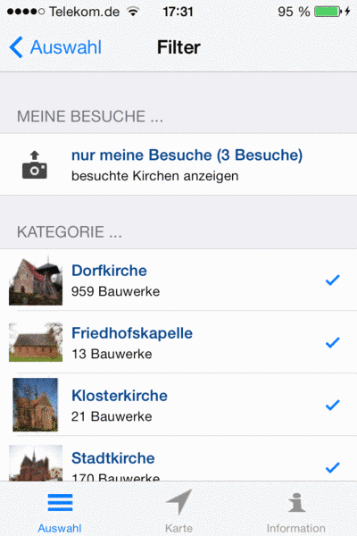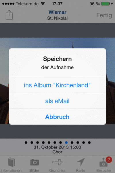 Der Anwender kann jeden Besuch in den Kirchen dokumentieren. Aufgenommene Bilder sind auch in der Bilderdarstellung mit der Besuchszeit sichtbar und können einzeln oder gemeinsam als eMail versendet oder in sozialen Medien geteilt werden.