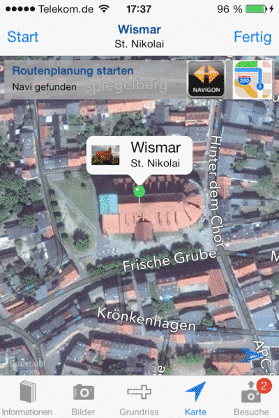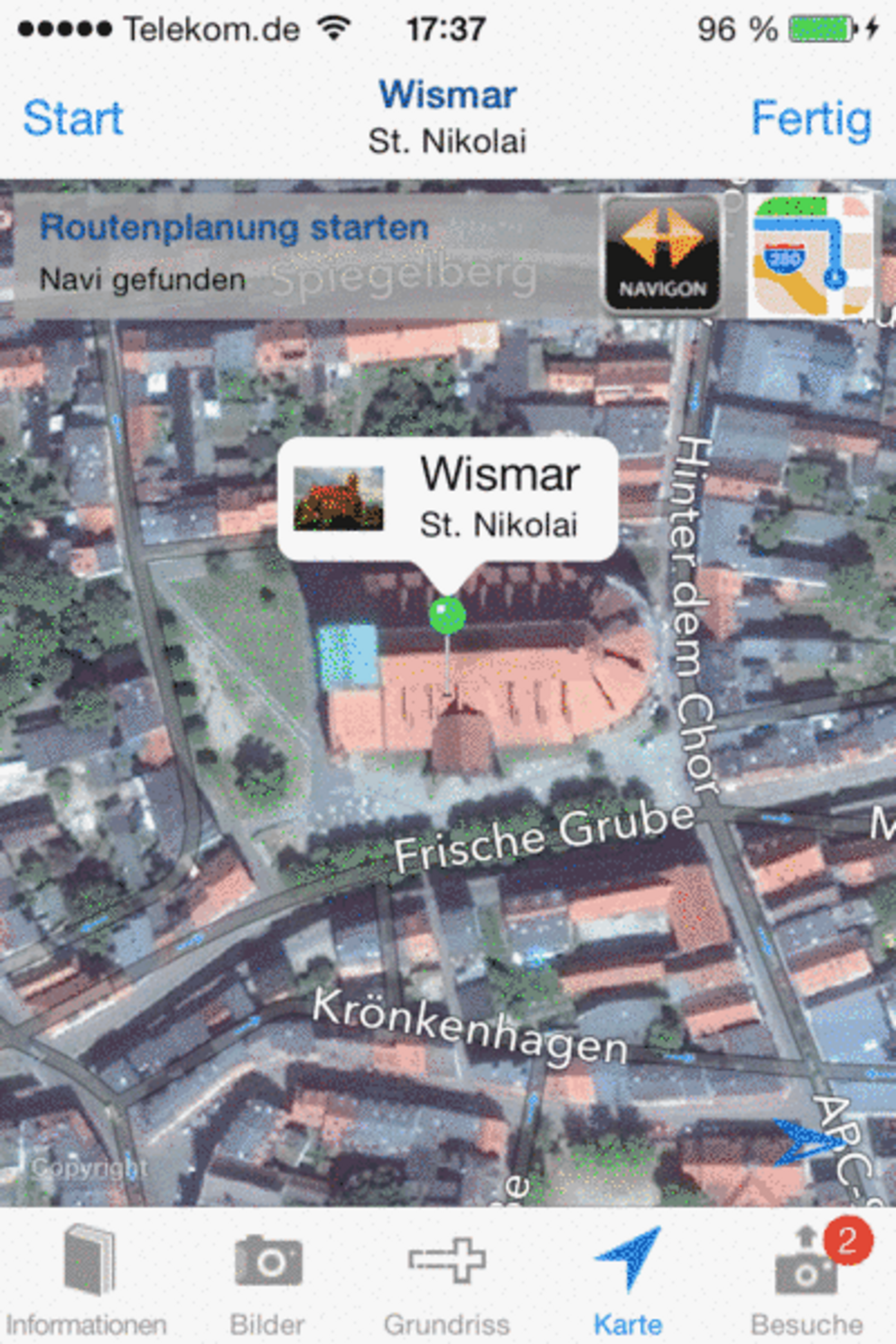 Die Kartendarstellung zeigt das ausgewählte Bauwerk. Die iPhone typischen Kartendarstellungen können ausgewählt werden.