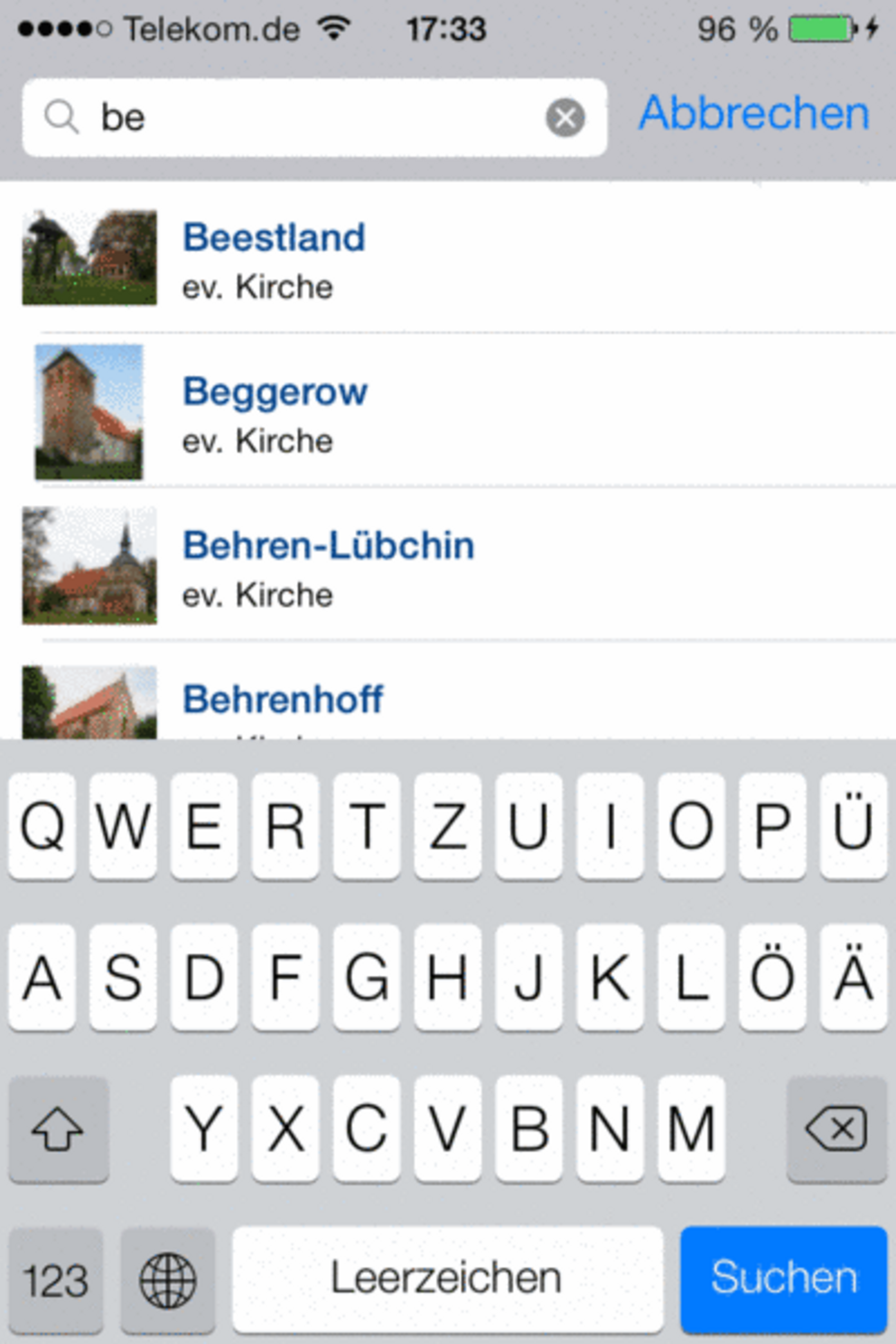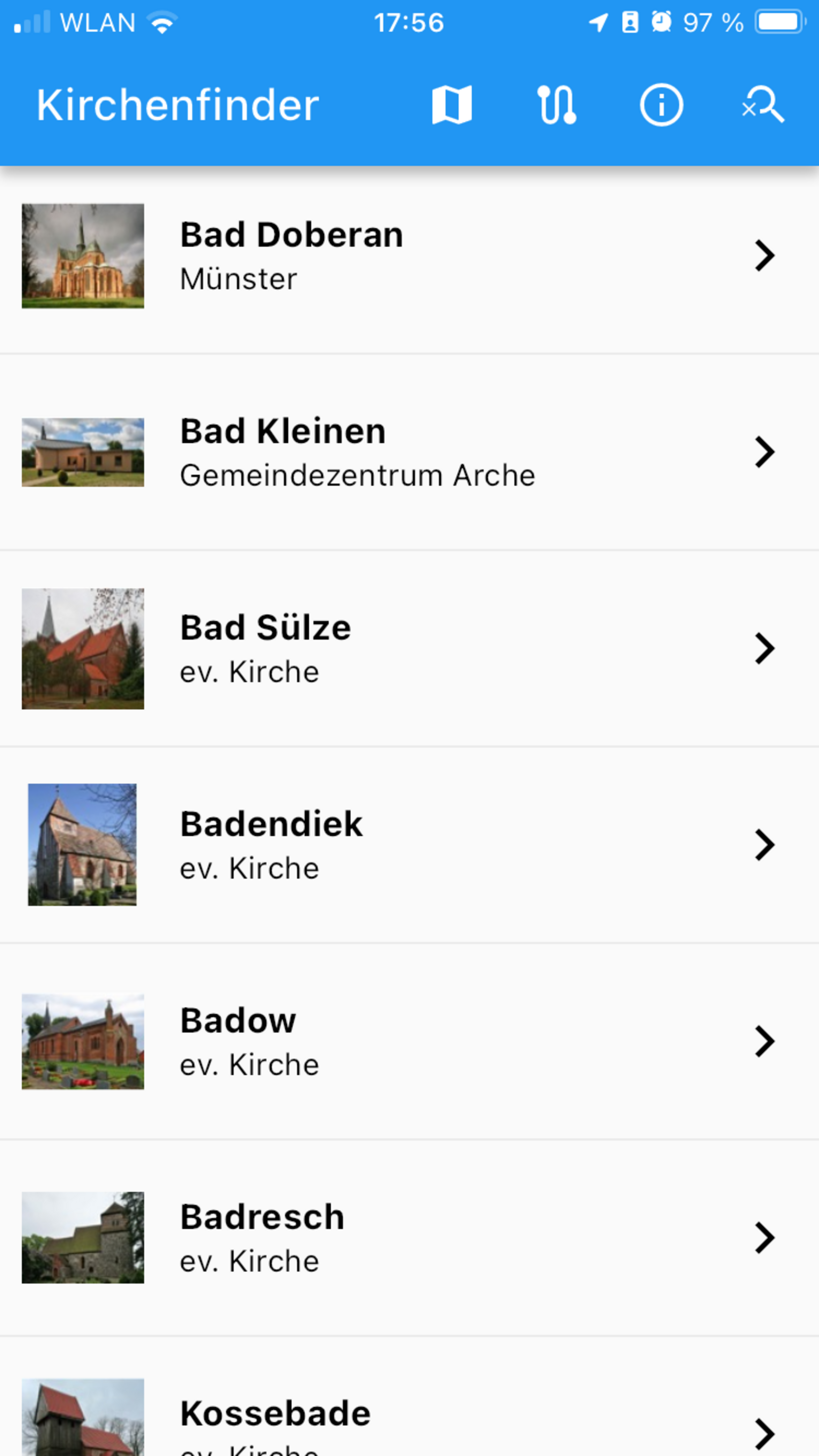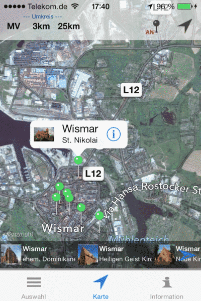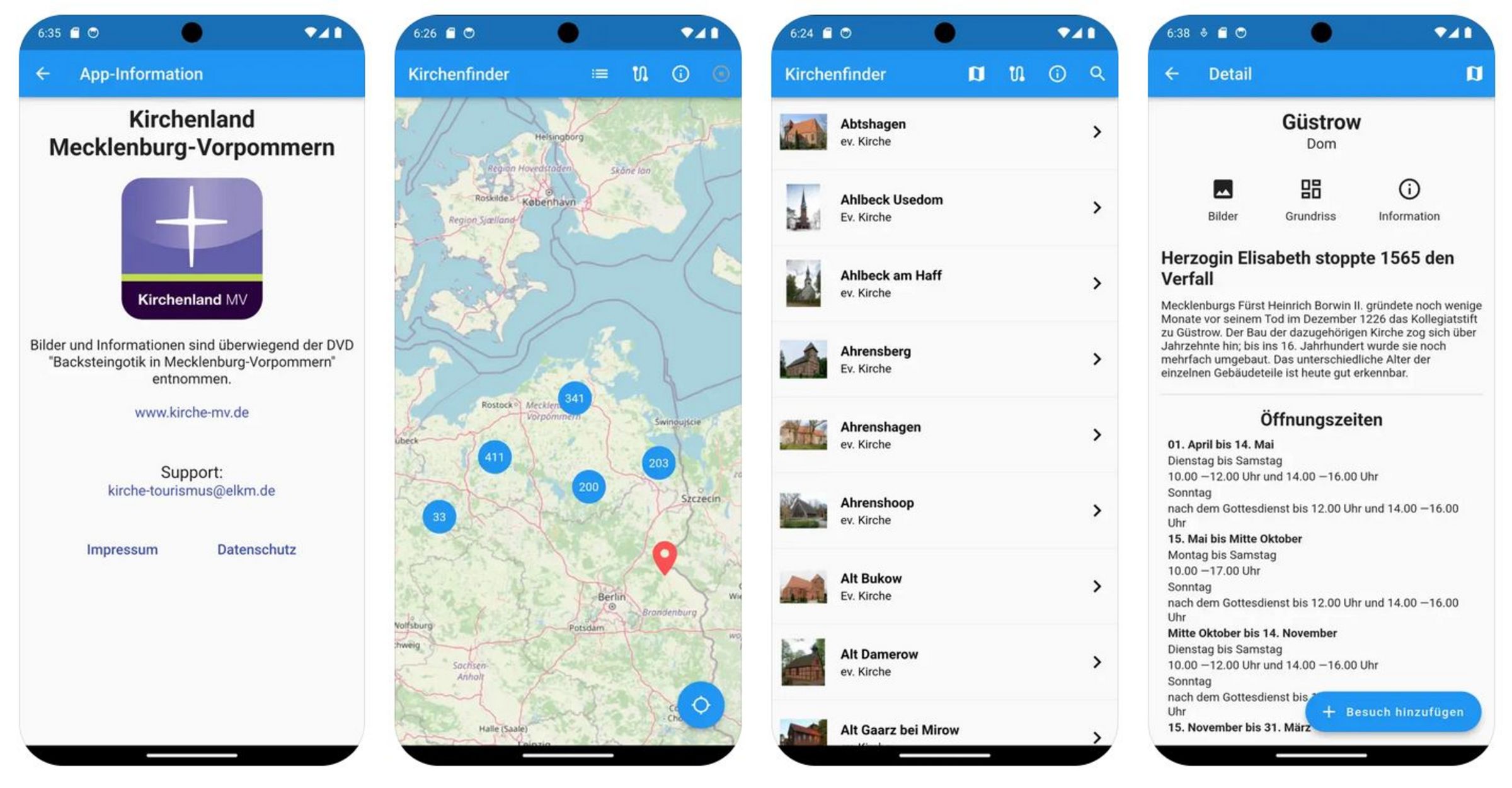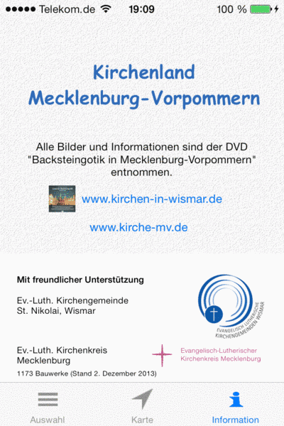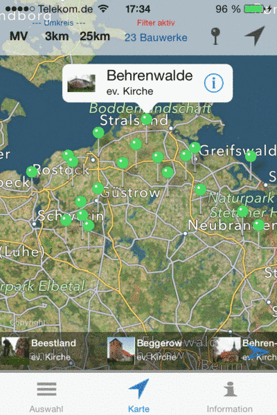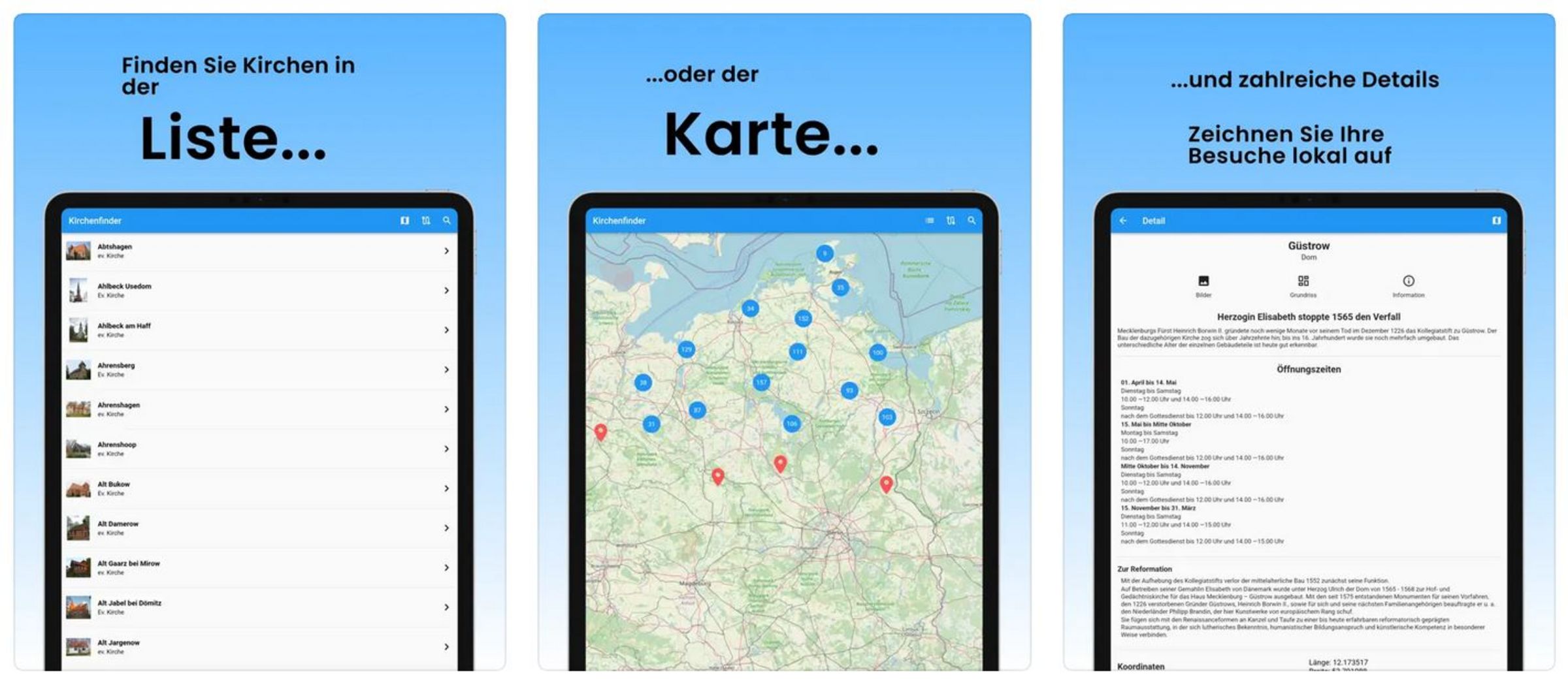 In Mecklenburg-Vorpommern gibt es eine Vielzahl an Kirchen und Kapellen. Mit dieser App können Sie sich mehr als tausend dieser meist großartigen Bauwerke vor dem Besuch anschauen. Die Kartendarstellung zeigt die Bauwerke in ihrer Umgebung. Mit Hilfe der integrierten Schnittstelle zu einer bei Ihnen installierten Navigationssoftware finden Sie auch leicht den Weg zu den Kirchen und Kapellen.