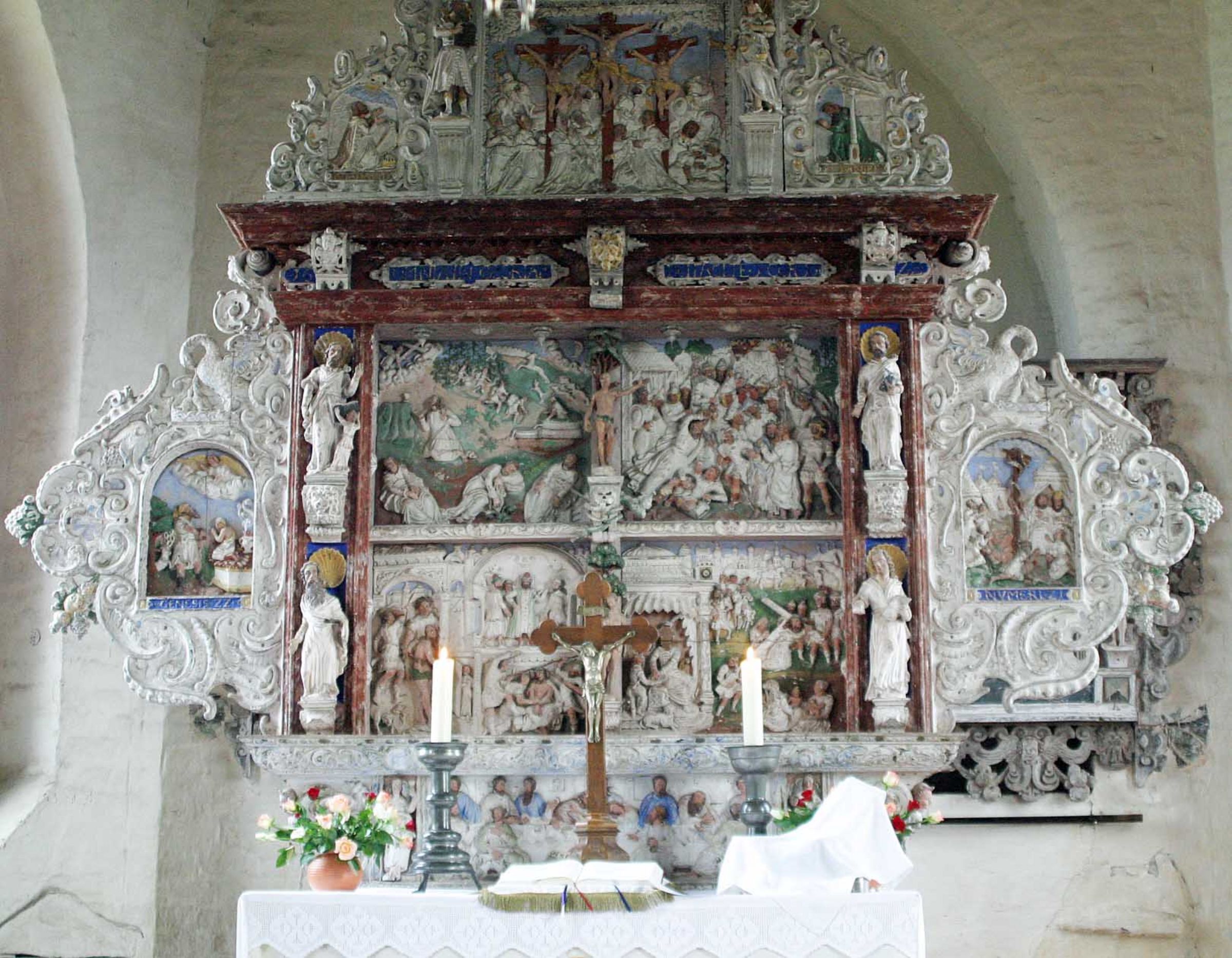 Für Herzog Adolf Friedrich I. von Mecklenburg- Schwerin (1588-1658) war es als Renaissancefürst von großer Bedeutung, an das Alter seiner Dynastie zu erinnern. Mit dem Ausbau der mittelalterlichen Dorfkirche unweit des alten Stammsitzes brachte er gleichzeitig sein lutherisches Bekenntnis gegenüber seinem zum Calvinismus konvertierten Bruder Johann Albrecht II. von Mecklenburg-Güstrow (1590-1636) zum Ausdruck. Beginnend mit der Kanzel (1618) und einer fürstlichen Empore, kulminiert dies im komplexen und künstlerisch äußerst hochwertigen Altaraufbau (1622). Der bewusste Einsatz figürlicher Darstellungen zur Unterstreichung der lutherischen Konzentration auf das Wirken Jesu Christi erfasst hier nicht nur Szenen des Neuen Testaments. Er setzt dem auch entsprechende alttestamentarische Geschehnisse und Allegorien gegenüber.