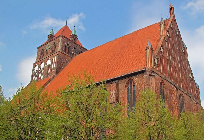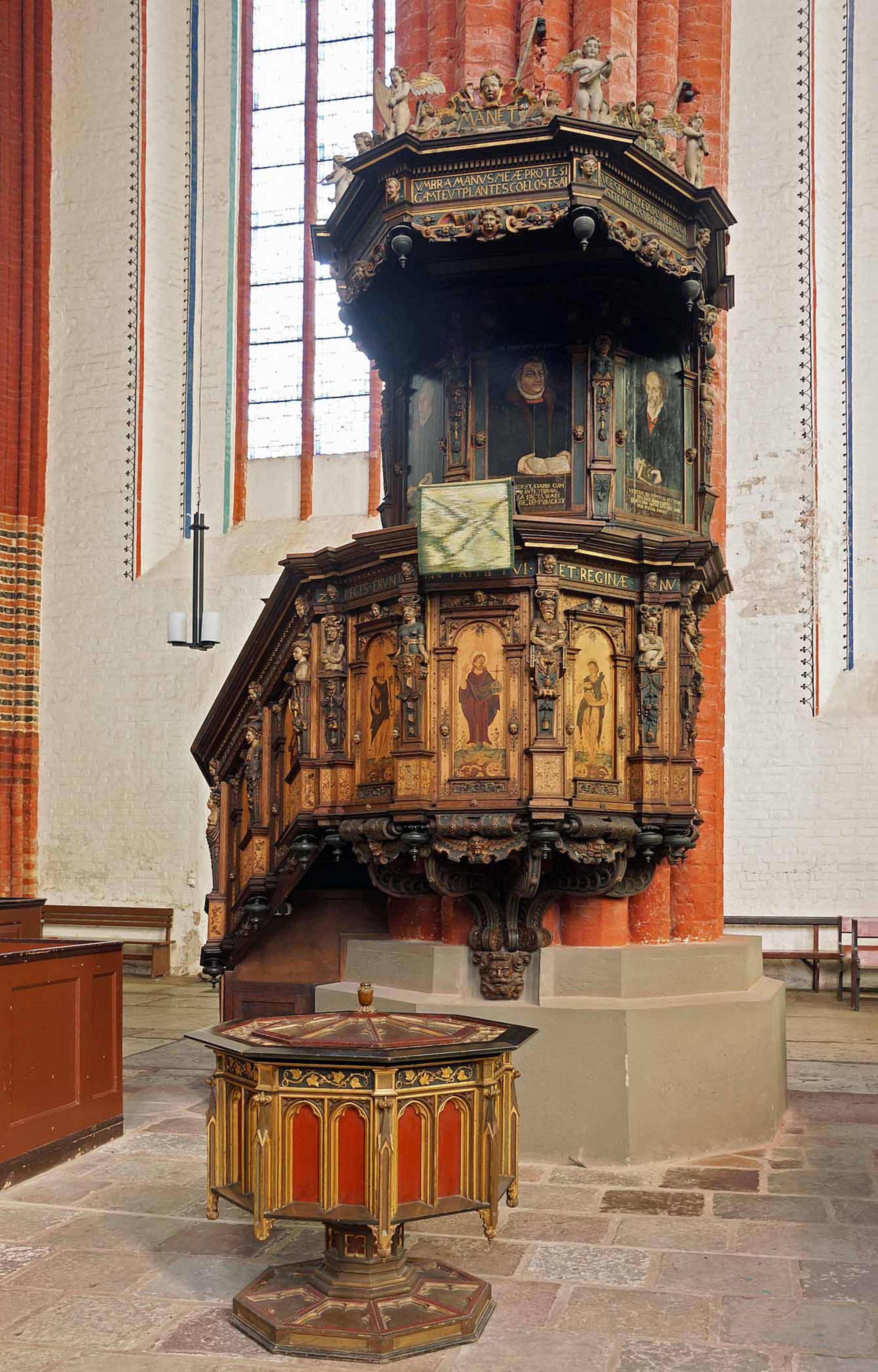 Der Greifswalder Dom St. Nikolai und die St. Marienkirche stellen deutlich die Unterschiede von Basilika und Hallenkirche heraus. Indem die Seitenschiffe in der Marienkirche dieselbe Höhe wie das Mittelschiff erhalten, gewinnt der Raum eine beindruckende Weite, die zum einen vom Altaraufbau aufgefangen wird, dessen Herzstück die äußerst qualitätsvolle Kopie von Correggios „Heiliger Nacht“ durch den Romantiker Friedrich August v. Klinkowström (1806/07) bildet. Zum anderen orientiert sich das feste Gestühl teilweise an der bereits 1587 geschaffenen Kanzel, die nicht nur ein bedeutendes Renaissancekunstwerk, sondern auch ein außergewöhnliches Reformationsbekenntnis darstellt. Von Greifswalder Ratsherren gestiftet, zeichnet sie sich durch kleinteilige Intarsien sowie eine Vielzahl von Schnitzwerken und lateinischen Inschriften aus. An der Kanzelrückwand ist Luther, flankiert von Bugenhagen und Melanchthon dargestellt.