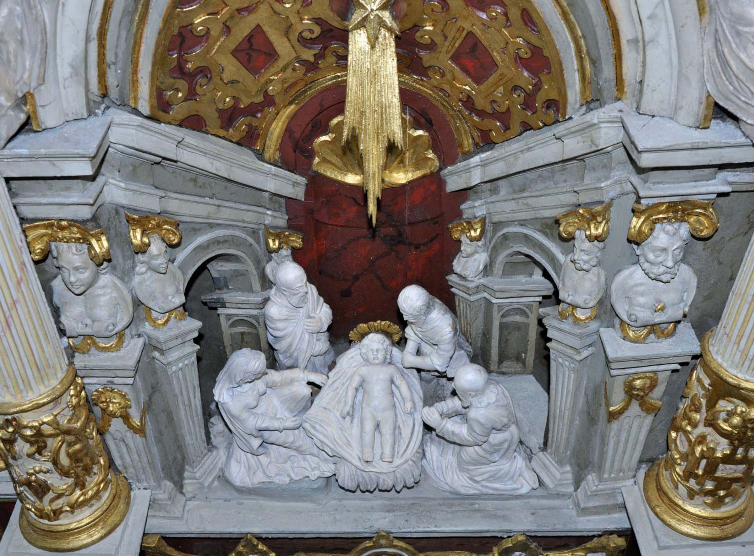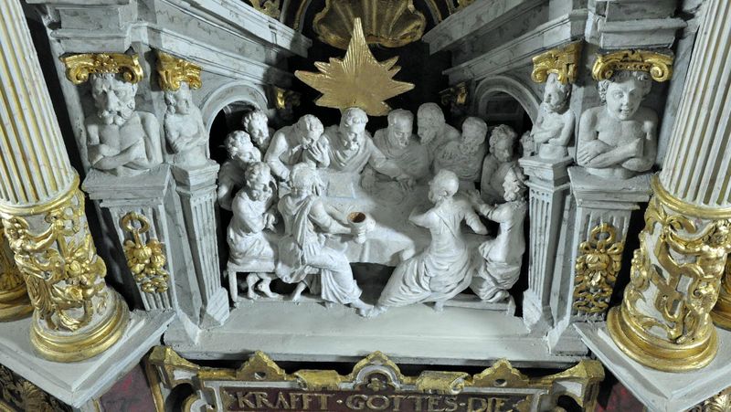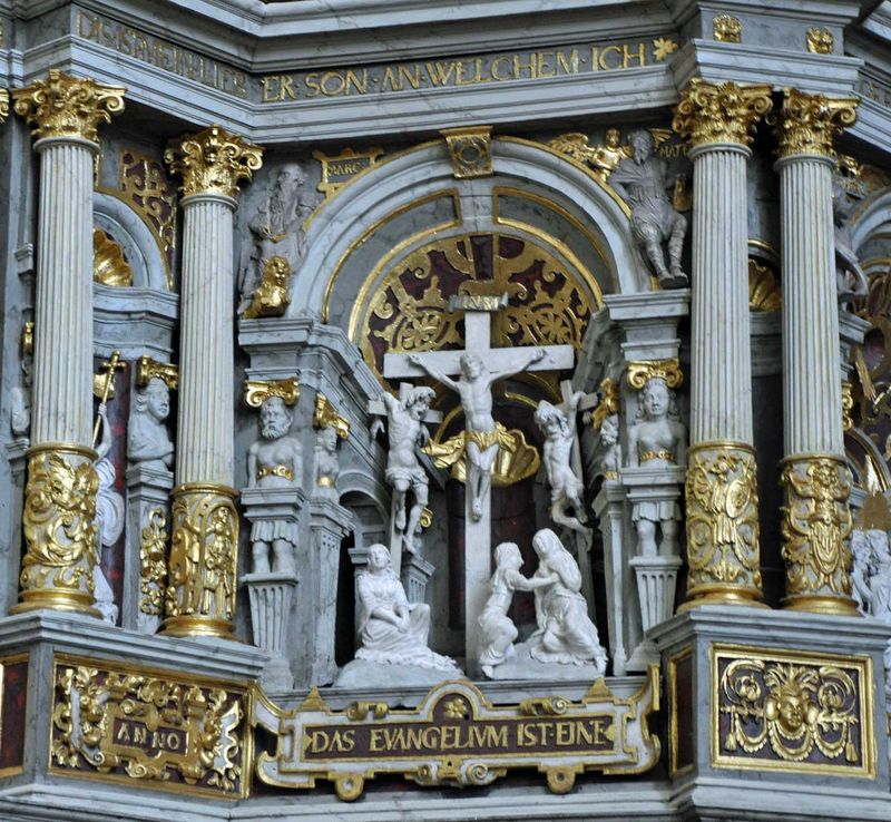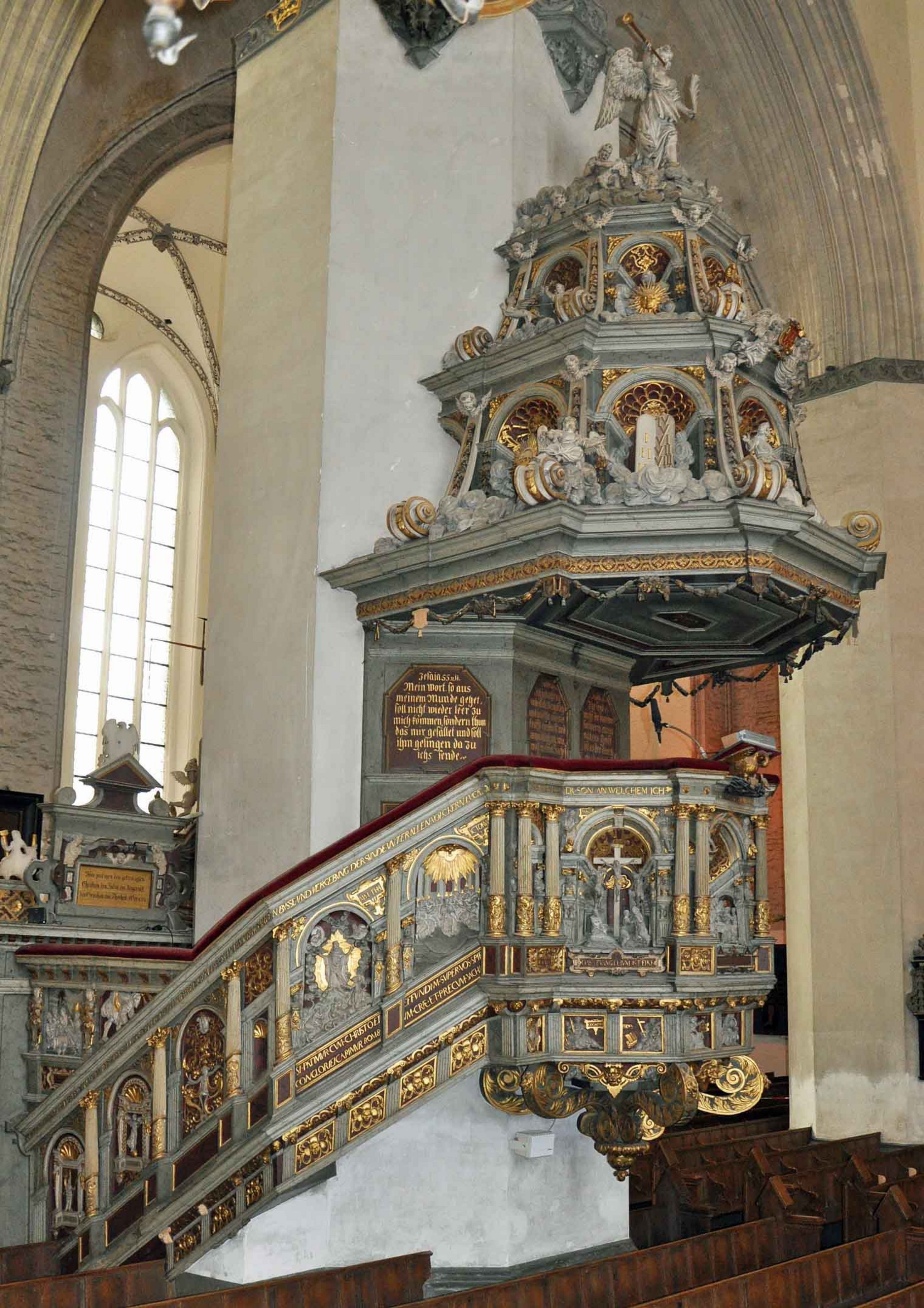 Das stilistische Zusammenspiel von tradierten mittelalterlichen Ausstattungsstücken sowie den Ein- und Umbauten aus Renaissance und Barock hatte neben St. Marien bis zum Zweiten Weltkrieg auch die St. Petri- und die St. Jakobikirche der Hansestadt geprägt. Wie deren einstige Kanzeln, wird auch die auf 1574 datierte Predigtstätte in St. Marien dem Antwerpener Künstler Rudolf Stockmann (gest. 1622) zugesprochen. Dabei ist jedoch lediglich der Kanzelkorb original. Der mehrzonige Schalldeckel wurde erst 1723 in stilistischer Anlehnung geschaffen. Äußerst qualitätsvoll ist die vollplastische architektonische Gliederung, die sich in übersteigerter Perspektive tiefenräumlich in Szenen des christlichen Heilsgeschehens fortsetzt. Diese erweitern mit Gleichnis- und Tugenddarstellungen die sonst häufig übliche Ikonographie der Evangelisten.