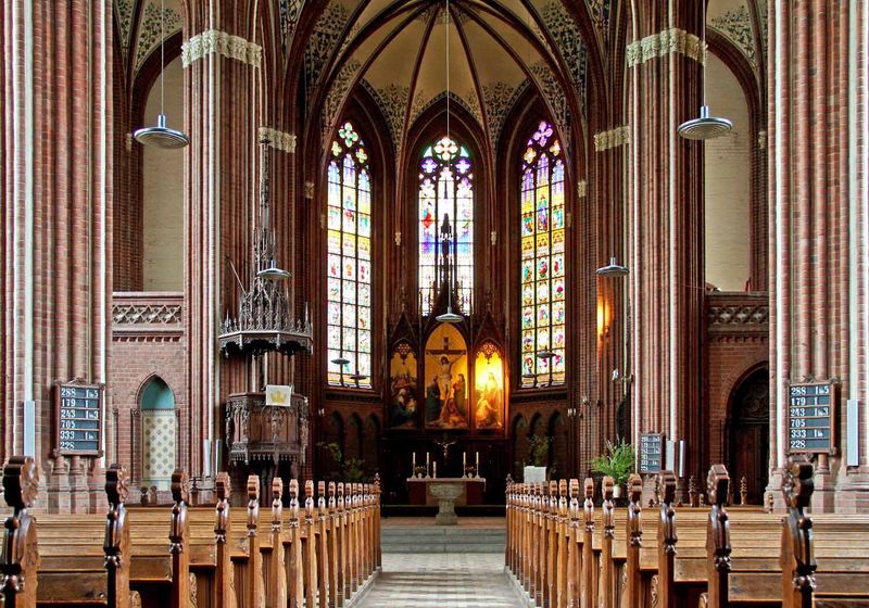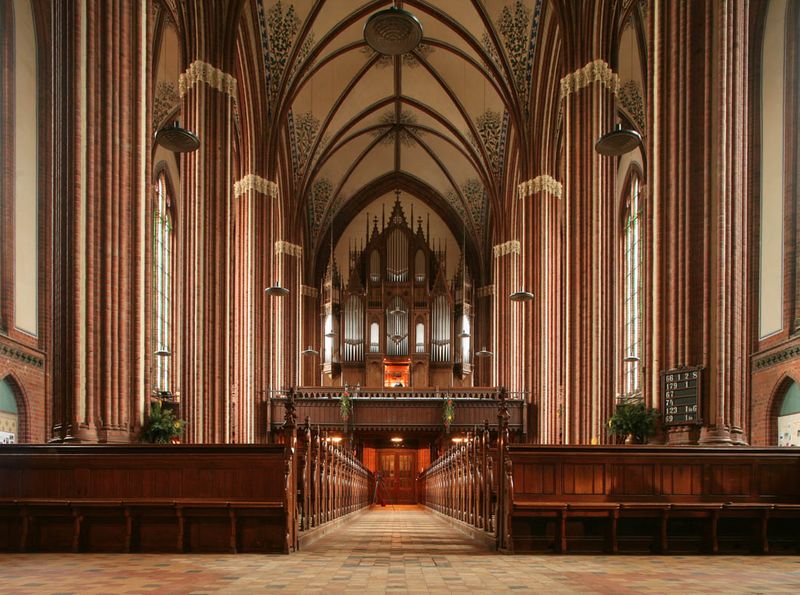 Das bedeutendste Werk des Kirchenbaumeisters Theodor Krüger (1818-1885) steht geradezu antithetisch den anderen hier vorgestellten, „gewachsenen“ Bauten gegenüber: Wie „aus einem Guss“ sind hier Architektur, Ausstattung und theologisch- liturgische Aussage geschaffen. Für das Baukonzept, das die hochgotische Formensprache als christliches Ideal definierte, war der spätere mecklenburgische Oberkirchenratspräsident Theodor Kliefoth (1810-1895) verantwortlich. Als Vertreter des Neuluthertums hatte Kliefoth im Jahr 1861 auch das „Eisenacher Regulativ“ maßgeblich mitbestimmt. Neben der „Stilreinheit“ war es besonders die klare Trennung von Kanzel und Altar, die das Spannungsverhältnis von Wort und Sakrament verdeutlichen sollte. Bereits 1863-1869 errichtet, ging die Paulskirche dem preußischen Kirchenbauboom am Ende des Jahrhunderts voran.