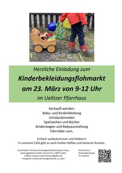 VeranstaltungKinderbekleidungsflohmarkt 23.03.2024 · 09:00 Uhr · 12:00 Uhr Pfarrhaus UelitzGrüne Straße 519077 Uelitz Im Kalender speichern (.ics) Route berechnen zurück zur Übersicht der Veranstaltungen