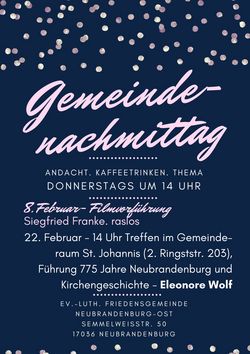 In dieser Woche treffen wir uns in de Gemeinderäumen von St. Johannis um 14 Uhr. Nach dem Kaffeetrinken gehen wir gemeinsam ins Stadtarchiv und Eleonore Wolf wird und durch die Ausstellung 775 Neubrandenburg und Kirchengeschichte führen.