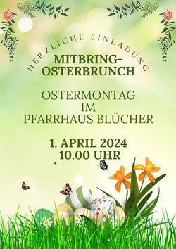 VeranstaltungOsterbrunch 01.04.2024 · 10:00 Uhr · 11:00 Uhr Pfarrhaus BlücherBergstraße 2119258 Blücher Wir beginnen mit einer Andacht in der Kirche Blücher. Im Kalender speichern (.ics) Route berechnen zurück zur Übersicht der Veranstaltungen
