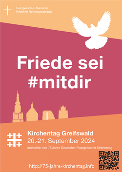 Am Freitag, 20. und Samstag, 21. September 2024 wird im Anschluss an ein wissenschaftliches Symposium im Alfried Krupp Wissenschaftskolleg (veranstaltet vom DEKT und der Universität Greifswald, Federführung Prof. Thomas Kuhn) das Kirchentagsjubiläum mitten in Greifswald gefeiert. Das Motto lautet Friede sei mit Dir!