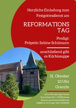 VeranstaltungReformationstag 31.10.2024 · 10:00 Uhr · 11:00 Uhr Kirche GranzinDorfstraße 21a19258 Greven Dateien ansehenherunterladen Im Kalender speichern (.ics) Route berechnen zurück zur Übersicht der Veranstaltungen
