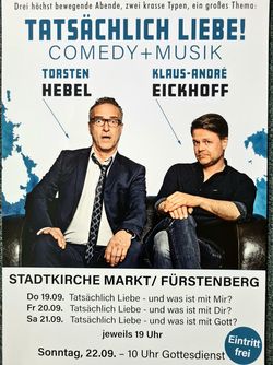Ein Theologe, Schauspieler und Kabarettist Torsten Hebel und der Musiker Klaus-André Eickhoff treffen aufeinander und präsentieren einen Mix aus Comedy, Musik und Tiefgang. Selbstironisch fühlen sie den großen Fragen des Lebens auf den Zahn.