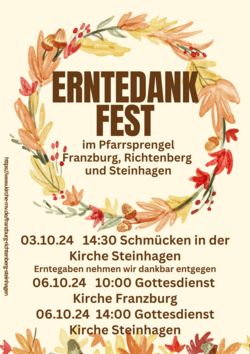 In diesem Gottesdienst möchten wir Gott für das, was er uns schenkt danken. Wir werden auf das Erntejahr zurückblicken und uns an den Gaben der Natur erfreuen. Die Kirche wird wieder festlich geschmückt sein, mit allerlei Obst, Gemüse und Korn.