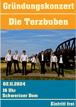 VeranstaltungGründungskonzert TERZBUBEN 02.11.2024 · 16:00 Uhr · 17:00 Uhr Dom SchwerinAm Dom 419055 Schwerin Im Kalender speichern (.ics) Route berechnen zurück zur Übersicht der Veranstaltungen