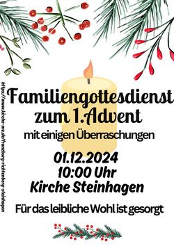 Wir laden alle, ob Groß und Klein, herzlich zum Familiengottesdienst am 1. Advent in die Kirche Steinhagen ein. Mit dabei sind einige Überraschungen. Sie dürfen also gespannt sein!