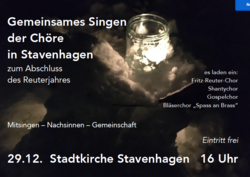 Veranstaltunggemeinsames Singen der Chöre der Stadt 29.12.2024 · 16:00 Uhr · 17:00 Uhr Stadtkirche StavenhagenBei der Kirche 117153 Stavenhagen Im Kalender speichern (.ics) Route berechnen zurück zur Übersicht der Veranstaltungen