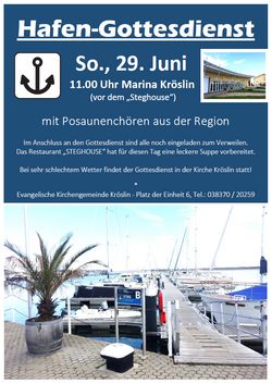 VeranstaltungHafen-Gottesdienst 29.06.2025 · 11:00 Uhr · 12:00 Uhr Hafen Marina KröslinSeestraße 17440 Kröslin Im Kalender speichern (.ics) Route berechnen zurück zur Übersicht der Veranstaltungen