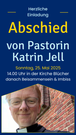 VeranstaltungGottesdienst zur Verabschiedung von Pastorin Katrin Jell 25.05.2025 · 14:00 Uhr · 15:00 Uhr Kirche BlücherBergstraße 19258 Blücher Im Kalender speichern (.ics) Route berechnen zurück zur Übersicht der Veranstaltungen