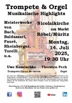 Auch in diesem Jahr gastieren der Solotrompeter und Weimarer Hochschulprofessor Uwe Komischke und der Konzertorganist Thorsten A. Pech am Montag 14. Juli 2025 um 19.30 Uhr in der Nicolaikirche am Markt in Röbel/ Müritz. Beide Musiker gehören zu den national und international bekannten Interpreten ihres Fachs. Seit 1977 konzertieren sie in der Kombination Trompete + Orgel zusammen, 28 CDs sind bislang erschienen, Konzertreisen in Deutschland, Europa und weltweit (u.a. China u. Japan) kennzeichnen die künstlerische Tätigkeit ebenso wie ihre Rundfunkproduktionen und Fernsehauftritte.