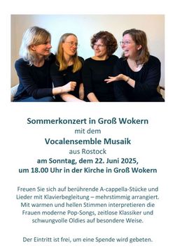 Konzert mit dem Vocalensemble Musaik Am Sonntag, dem 22. Juni 2025, sind Sie herzlich eingeladen zu einem Konzert mit dem Vocalensemble Musaik aus Rostock um 18.00 Uhr in der Kirche in Groß Wokern. Freuen Sie sich auf berührende A-cappella-Stücke sowie Lieder mit Klavierbegleitung – mehrstimmig arrangiert. Mit warmen und hellen Stimmen interpretieren die Frauen moderne Pop-Songs, zeitlose Klassiker und schwungvolle Oldies auf besondere Weise. Der Eintritt ist frei, um eine Spende wird gebeten.
