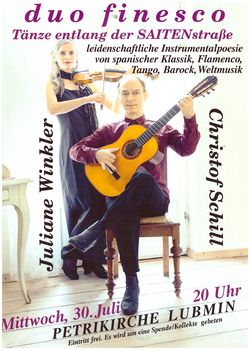 VeranstaltungKonzert mit duo finesco 30.07.2025 · 20:00 Uhr · 21:00 Uhr PetrikircheFreester Straße 1017509 Lubmin Im Kalender speichern (.ics) Route berechnen zurück zur Übersicht der Veranstaltungen