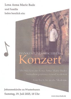 VeranstaltungKonzert mit Lena Bade 19.07.2025 · 18:00 Uhr · 19:00 Uhr JohanneskircheAlte Wolgaster Straße 17509 Wusterhusen Im Kalender speichern (.ics) Route berechnen zurück zur Übersicht der Veranstaltungen