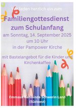VeranstaltungGottesdienst zum Schulanfang 14.09.2025 · 10:00 Uhr · 11:00 Uhr Kirche PampowSchmiedeweg 519075 Pampow Dateien ansehenherunterladen Im Kalender speichern (.ics) Route berechnen zurück zur Übersicht der Veranstaltungen