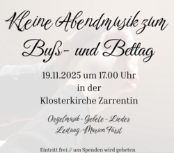 VeranstaltungKleine Abendmusik zum Buß- und Bettag 19.11.2025 · 17:00 Uhr · 18:00 Uhr Kirche ZarrentinKirchplatz 19246 Zarrentin am Schaalsee Im Kalender speichern (.ics) Route berechnen zurück zur Übersicht der Veranstaltungen