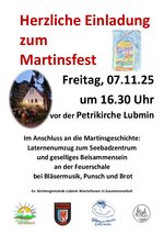 VeranstaltungMartinsfest 07.11.2025 · 16:30 Uhr · 17:30 Uhr PetrikircheFreester Straße 1017509 Lubmin Dateien ansehenherunterladen Im Kalender speichern (.ics) Route berechnen zurück zur Übersicht der Veranstaltungen