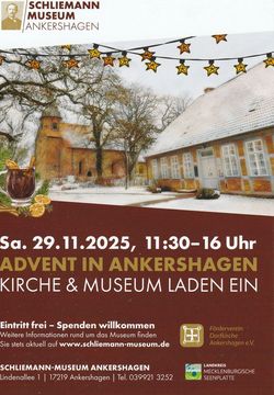 Das Heinrich-Schliemann-Museum, die Kirchengemeinde Möllenhagen/Ankershagen und der Förderverein Dorfkirche Ankershagen e.V. laden am Samstag, dem 29. November 2025, zum „Advent in Ankershagen“ in das Museum und in die Kirche ein. Von 11:30 bis 16 Uhr gibt es dort als stimmungsvollen Auftakt in den Advent ein gemütliches Programm für Jung und Alt.