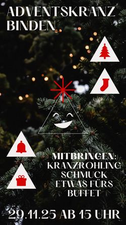 Am Samstag vorm ersten Advent wollen wir wieder Adventsrkränze binden. Die Gemeinde stellt das Tannengrün, Sie bringen Ihren Kranz und Schmuck mit. Gern auch etwas für unser Buffet, so können sich Groß und Klein stärken. Es gibt außerdem die Möglichkeit zum Kerzen ziehen.