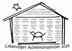 Werktags vom 01.- 23.12.2025 um 17.00 - 17.30 Uhr öffnet sich wieder eine Tür in unseren Kirchengemeinden und lädt Sie ein, gemeinsam zu singen, zu beten und einen Impuls für den jeweiligen Tag zu hören.