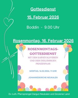 VeranstaltungRosenmontagsgottesdienst 16.02.2026 · 11:00 Uhr · 12:00 Uhr St. Johannes Kirche NeukalenAm Markt 17154 Neukalen Im Kalender speichern (.ics) Route berechnen zurück zur Übersicht der Veranstaltungen