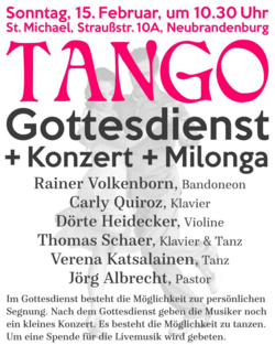 Im Gottesdienst besteht die Möglichkeit der persönlichen Segnung. Nach dem Gottesdienst geben die Musiker noch ein kleines Konzert. Es darf getanzt werden. Um eine Spende für die Livemusiker wird gebeten.