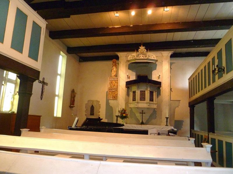 Der Kanzelaltar trägt zwei Altarflügel aus dem 15. Jh., die vermutlich zu einem Flügelaltar aus dem Lübecker Raum gehörten. Die beiden zeigen an der Außenseite die Verkündigung der Geburt Jesu an die Jungfrau Maria. Die Schnitzereien der inneren Seiten wurden bei einer Renovierung mit grauer Ölfarbe übermalt, die gerade wieder abgetragen wird. Die rechte Seite zeigt oben die Begegnung zwischen Maria und Elisabeth. Unten sehen wir die Jünger Matthäus und Bartholomäus. Auf der linken Seite sind ebenfalls mehrere Heilige abgebildet: Jakobus mit Buch und Stab, Andreas mit dem Kreuz, Agnes mit dem Lamm und Petrus mit Buch in der Hand. Die beiden großen Figuren auf dem Altar stellen Maria und den Jünger Johannes dar.