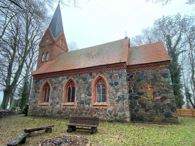 Die heutige Kirche 1868 geweiht. Gebaut wurde sie vom Schinkelschüler Friedrich Wilhelm Buttel, der als Hofbaumeister des Großherzogtum Mecklenburg-Strelitz auch schon die Orangerie und die Schloßkirche in Neustrelitz entworfen hatte.