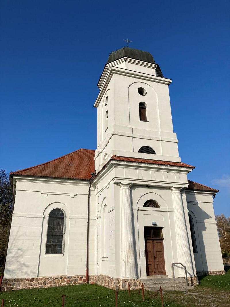 Die Kirche wurde 1808-1813 in klassizistischen Formen erbaut. Der bemerkenswerte Grundriß, der mit dem traditionellen Aufbau bricht, ist gemäß der Anforderungen einer protestantischen Predigtkirche konzipiert: Altar und Kanzel befinden sich in der Mitte der rückwärtigen Längsseite. Die übrigen drei Seiten werden von Emporen umzogen. Der Eingang befindet sich an der vorderen Längsseite und führt durch einen vorgelagerten Turm (vgl. Stadtkirche Neustrelitz). Die Kirche ist nicht nach Osten hin ausgerichtet.